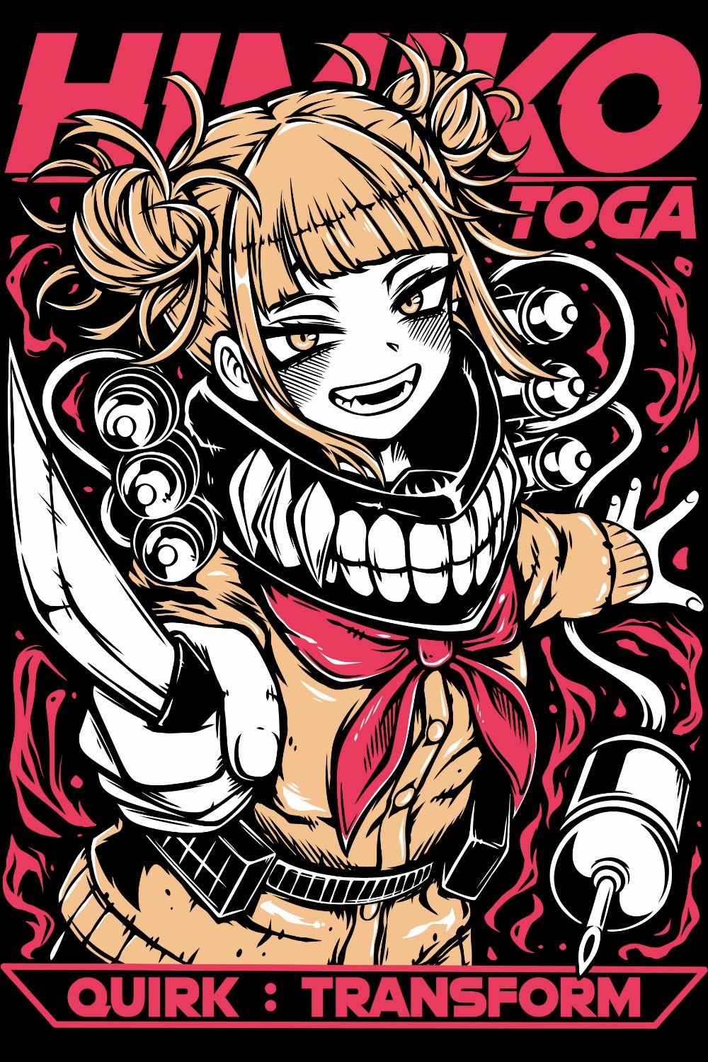 Use this Himiko Toga PNG to create edgy and eye-catching designs. Her unique “yandere” aesthetic is incredibly popular and makes for highly engaging content that stands out from the typical heroic visuals of the series.