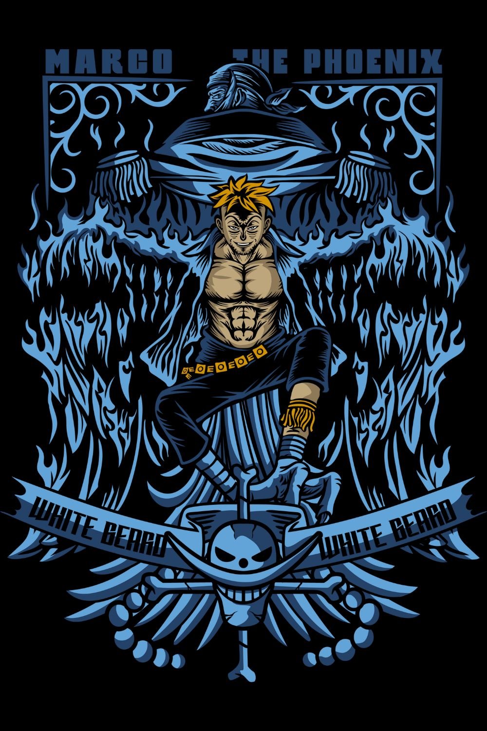 Create a T-shirt that is as beautiful as it is powerful with this vibrant Marco the Phoenix PNG. This digital graphic features the former 1st division commander of the Whitebeard Pirates, Marco, in his mythical Zoan phoenix form. His blue and yellow flames of regeneration are not just a power, they are a stunning visual that makes for an absolutely incredible T-shirt design.